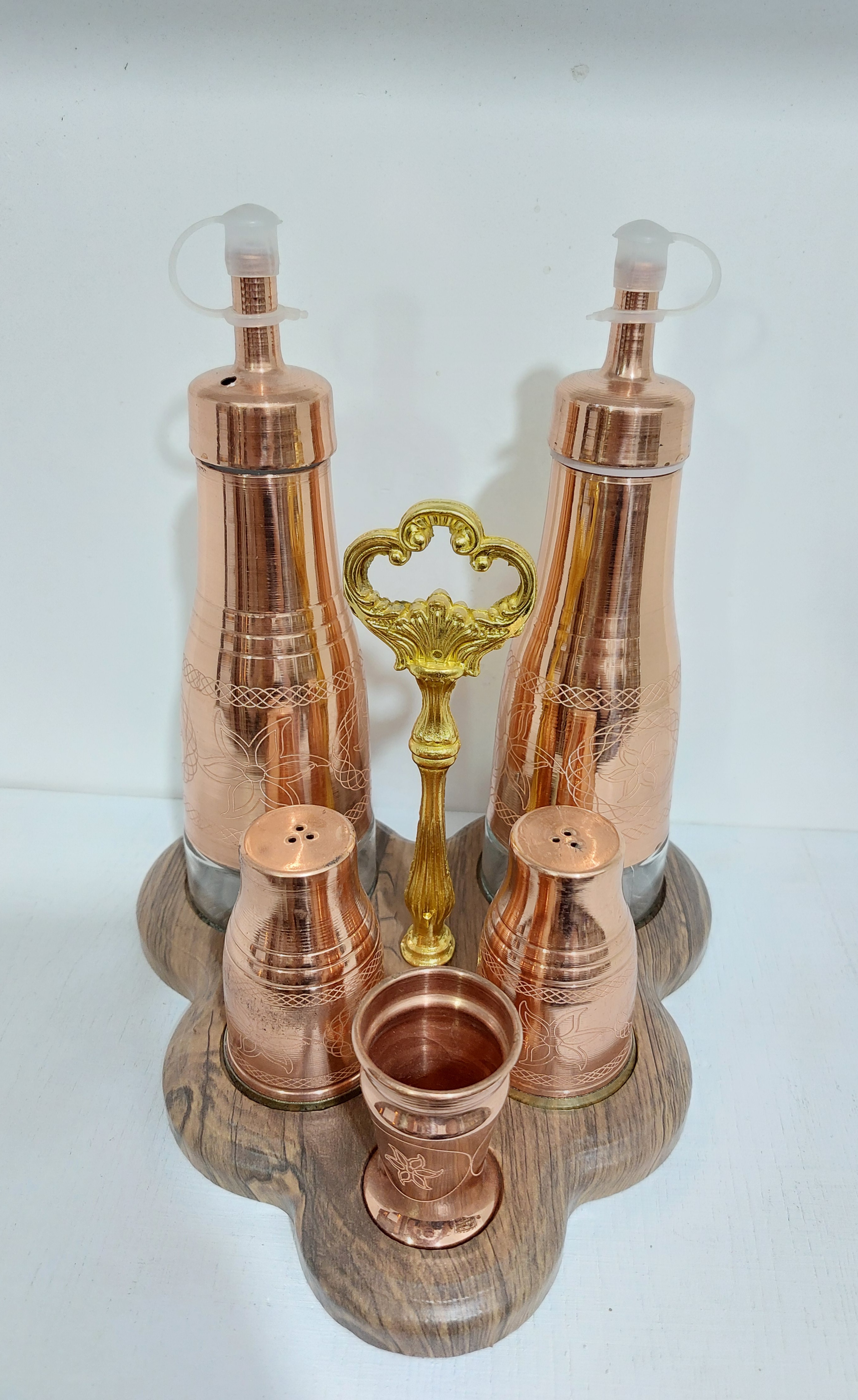 سرویس آشپزخانه مسی،جای آبلیمو و روغن و ادویه با طرح بدنه لیزری و پایه چوبی و بدنه شیشه ای نانو شده بدون تغییر رنگ مناسب آشپزخانه شما .